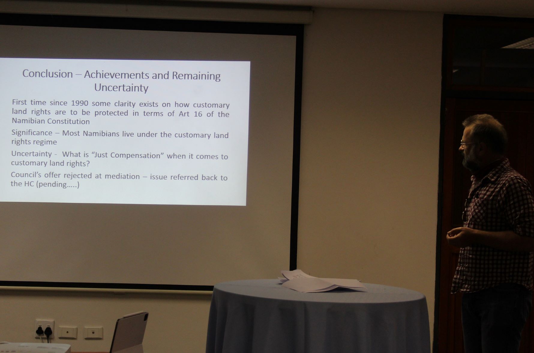 The presentation and discussions were focused around the ruling of the Supreme Court on Kashela Vs Katima Mulilo Town Council , whereby the court upheld the existence of customary land rights and the need to honour those rights, when communal land is transferred to local authorities.
